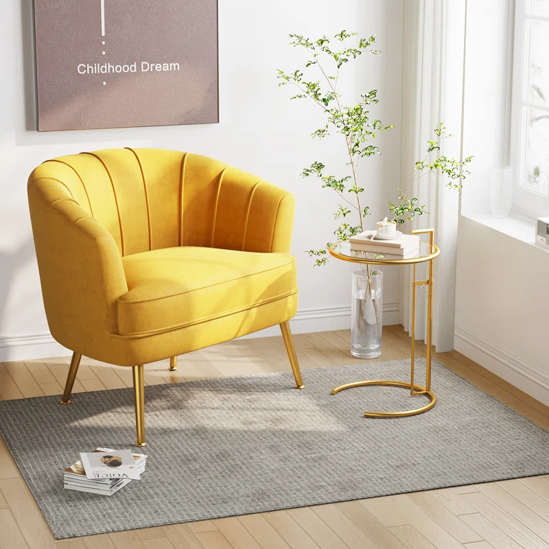 This accent armchair updates your reading nook with some Hollywood glamor. It’s built with a solid and engineered wood frame that sits four tapered and flared legs in a golden hue.